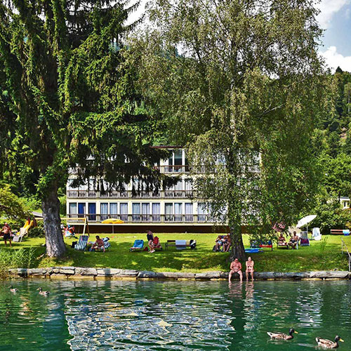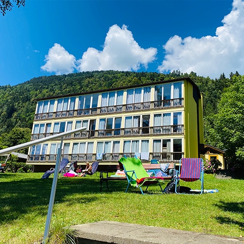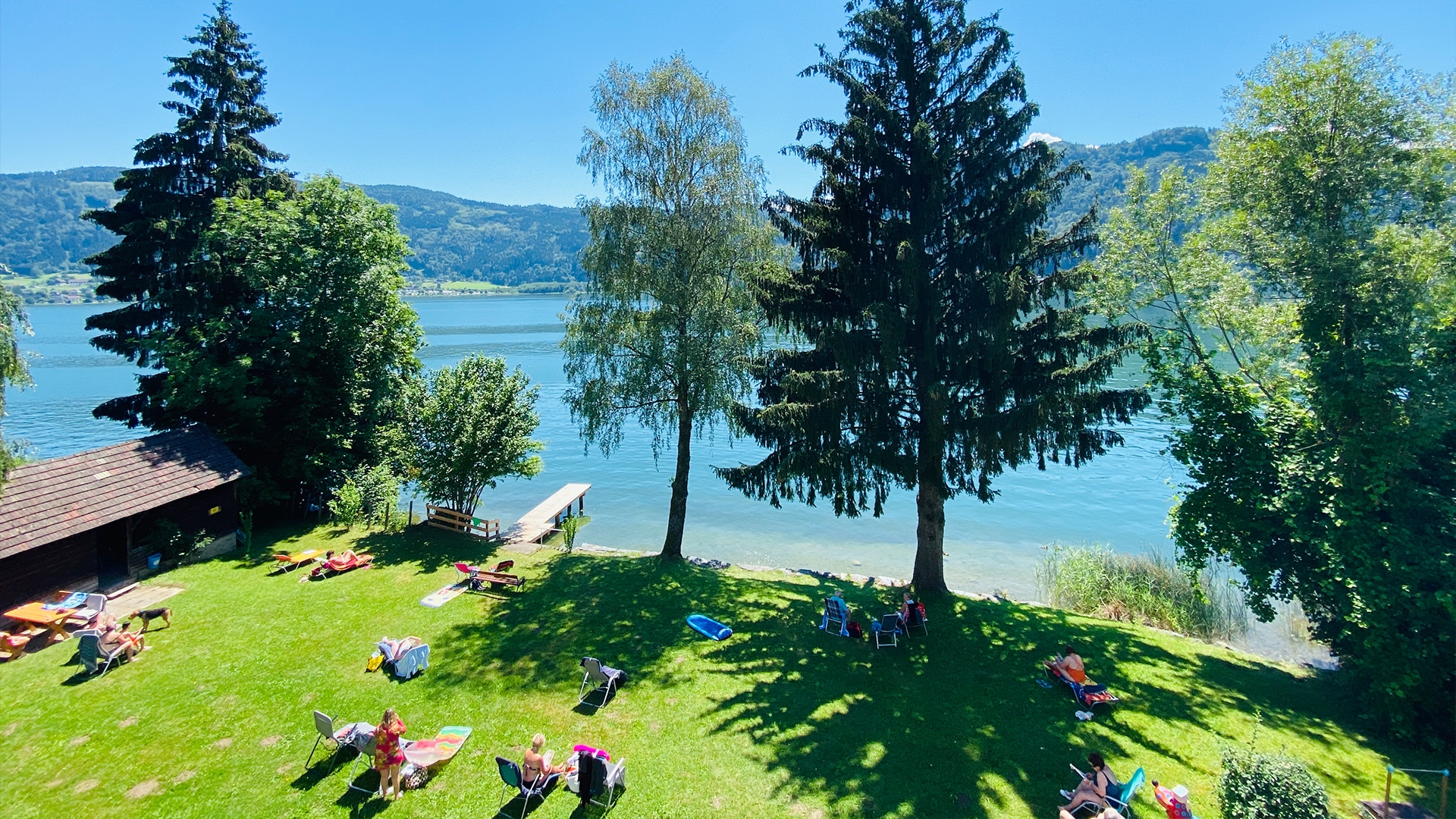 Unser Haupthaus befindet sich angrenzend an ein Waldstück. Nur 80m liegt der hauseigene Badestrand am Ossiacher See, welchen Sie zu jeder Tageszeit kostenlos nützen können. Die Zimmer im Haupthaus sind liebevoll eingerichtet und bieten alles, was Sie für Ihren Urlaub am Ossiacher See benötigen. Jedes Zimmer verfügt über Dusche/WC und SAT-TV, die seeseitigen Zimmer über einen Balkon mit Seeblick. Die Straßenseitigen Zimmer sind ausnahmslos mit Schallschutzfenstern ausgestattet. So können Sie in Ruhe Ihren Dornröschenschlaf genießen. Abendessen und Frühstück werden im Haupthaus serviert.